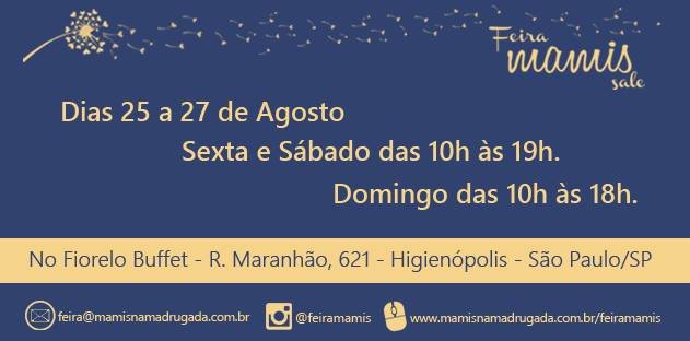 Nos dias 25, 26 e 27 de agosto o Buffet Fiorelo recebe a 4ª Edição da Feira Mamis, uma feira boutique com entrada gratuita e curadoria da equipe Mamis na Madrugada, reunindo grandes marcas que vão apresentar produtos exclusivos, novidades e tendências para bebês, crianças e mamães.