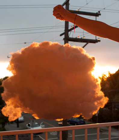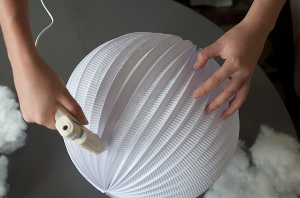 Com o enchimento pronto ao redor da lanterna e no formato que vocês queiram, a nuvem está terminada! Agora, amarrem o fio de nylon ou a linha de pesca na lanterna. É ele que vai deixá-la pendurada.