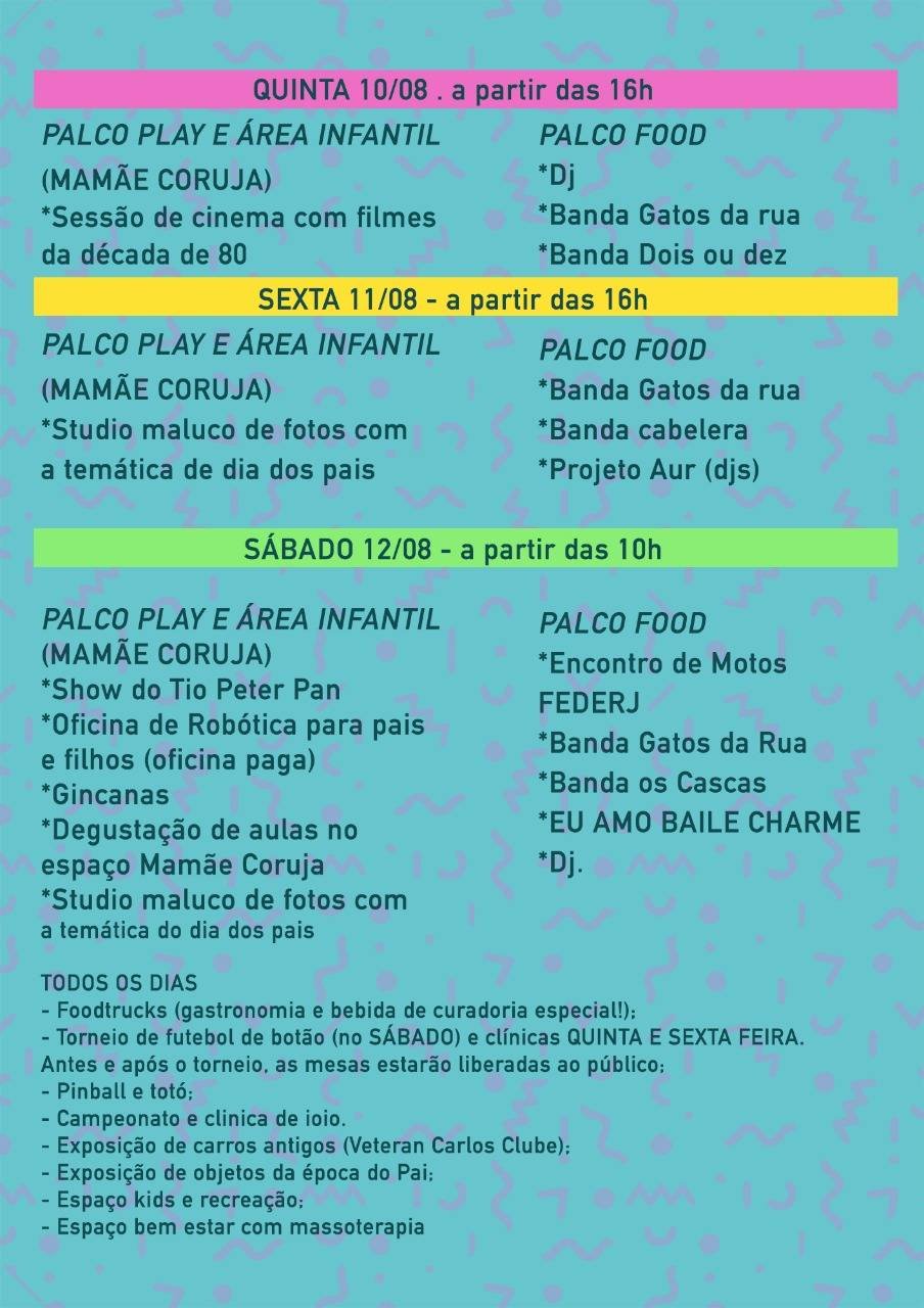 Exposição de carros com curadoria do Veteran Car Club, motos e objetos antigos, campeonato de botão e brincadeiras da infância, gastronomia e shows.