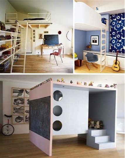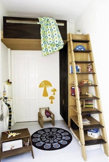 Vejam que ideia excelente para otimizar quartos pequenos para crianças: criar um mini loft! Ou seja, a cama fica em cima (como um beliche) e a parte inferior pode ser aproveitada para colocar brinquedos, escrivaninhas, estantes etc. Claro que para esse tipo de decoração o quarto precisa ter um pé direito alto e, além disso, a criança tem que ser mais velha para não correr o risco de cair.