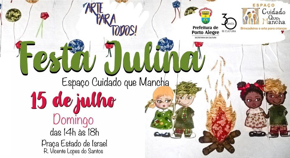 O espaço Cuidado Que Mancha promete muito sorriso, música e brincadeiras na Festa Julina que acontece neste domingo, 15, a partir das 14h na Praça Estado de Israel, que fica em frente ao espaço.